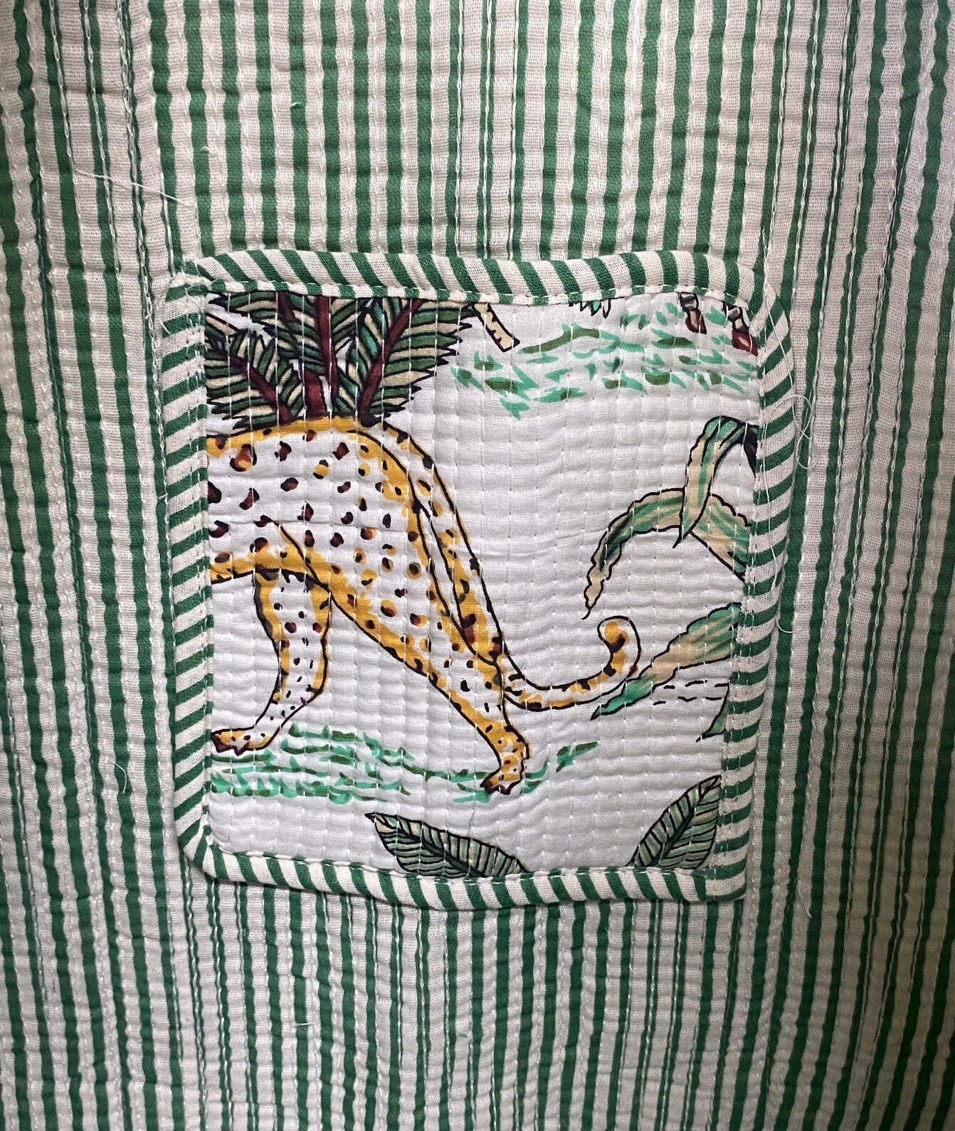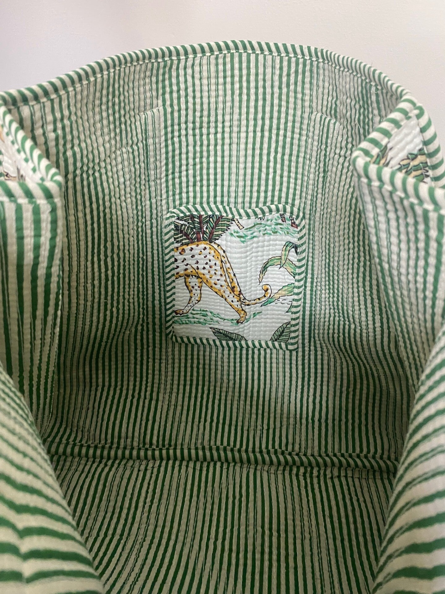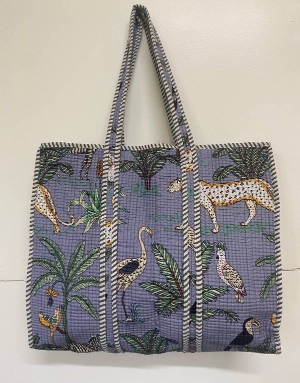 Introducing our Safari Print shopping bag, featuring a vibrant African design with zebras, cheetahs, and birds from the jungle. Made from unique block printed fabrics, this bag is not only stylish but also durable. It includes an internal pocket to fit your phone, keeping your essentials organized while on the go. The durable straps encircling the design ensure comfortable wear and strength, so you can carry all your shopping with ease. Add a touch of adventure to your everyday errands with this fun and practical Safari Print shopping bag.